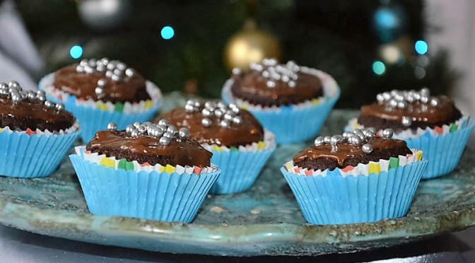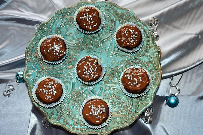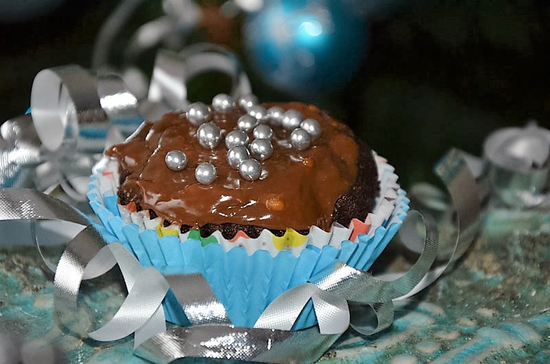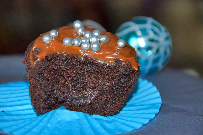 Mocno czekoladowe babeczki z nutką korzenną z nadzieniem z powideł śliwkowych i przepyszną polewą kajmakowo-czekoladową. Upieczone specjalnie do przedszkola synka na poczęstunek z okazji jasełek:) Polecam upiec na Święta, przypominają smakiem piernika:)