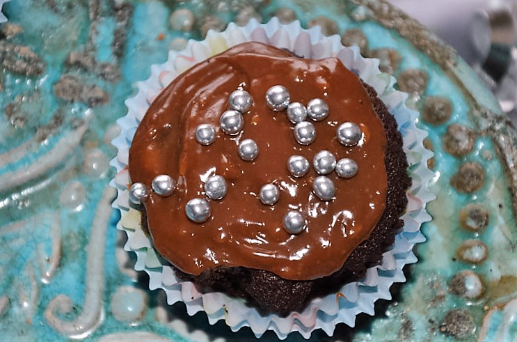 Czekoladowo-korzenne babeczki z powidłami śliwkowymi i polewą kajmakową