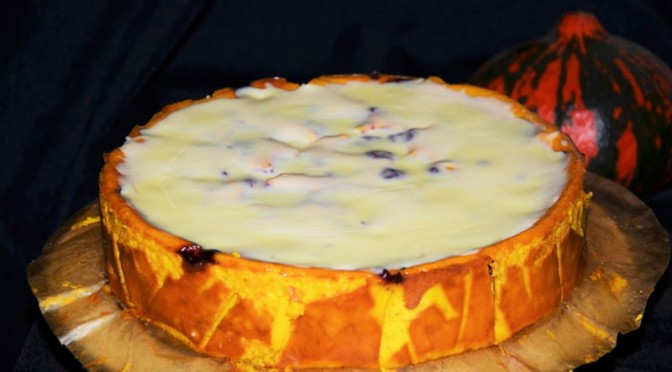 Kremowy sernik dyniowy z konfiturą wiśniową i polewą z białej czekolady