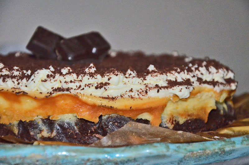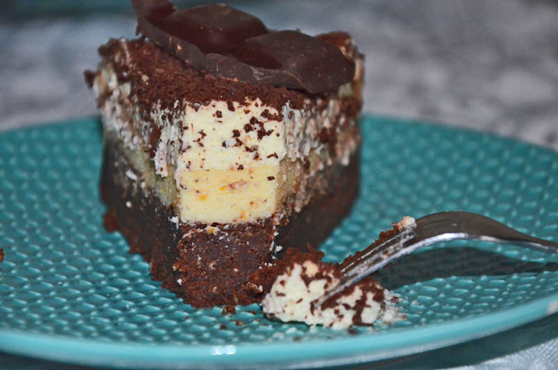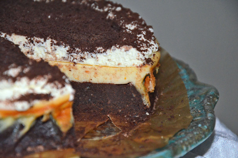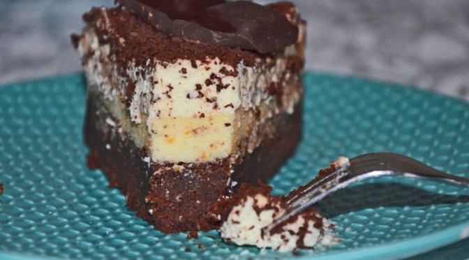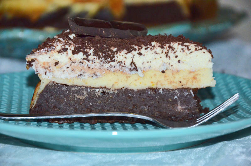 Spód ciasta to zbite, ciężkie i intensywne brownie. Środkową warstwę stanowi masa serowa z dodatkiem skórki pomarańczowej. Całość dopełnia pyszny krem ze śmietany i serka mascarpone. Polecam fanom gorzkiej czekolady i nie tylko:)