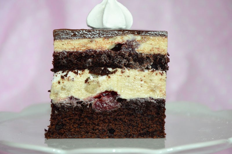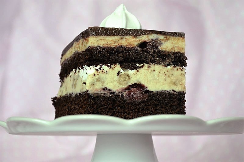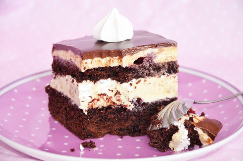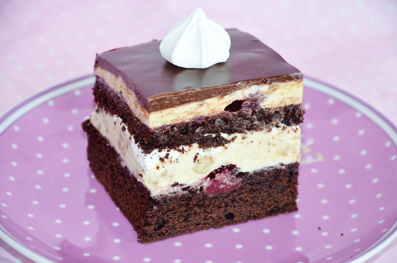 Mocno czekoladowe ciasto przełożone pysznym kremem chałwowym z dodatkiem pokruszonej bezy. Słodycz ciasta przełamuje dość spora ilość konfitury wiśniowej. Całość oblana przepyszną i puszystą polewą czekoladową. Ciasto jest bardzo dobre, mocno kremowe i na pewno wszystkim będzie smakowało, tego jestem pewna:)) Polecam wypróbować przepis:))