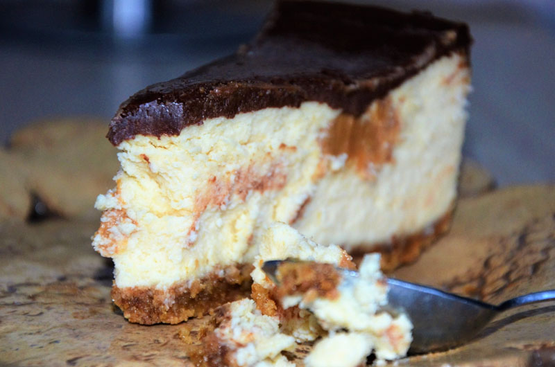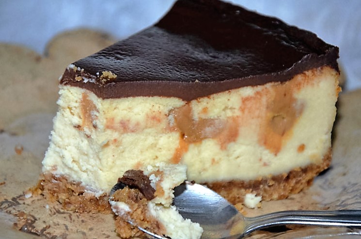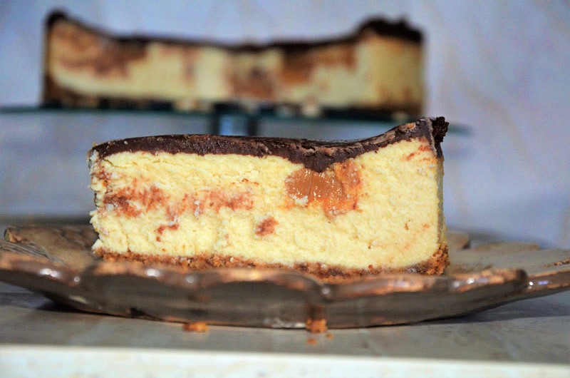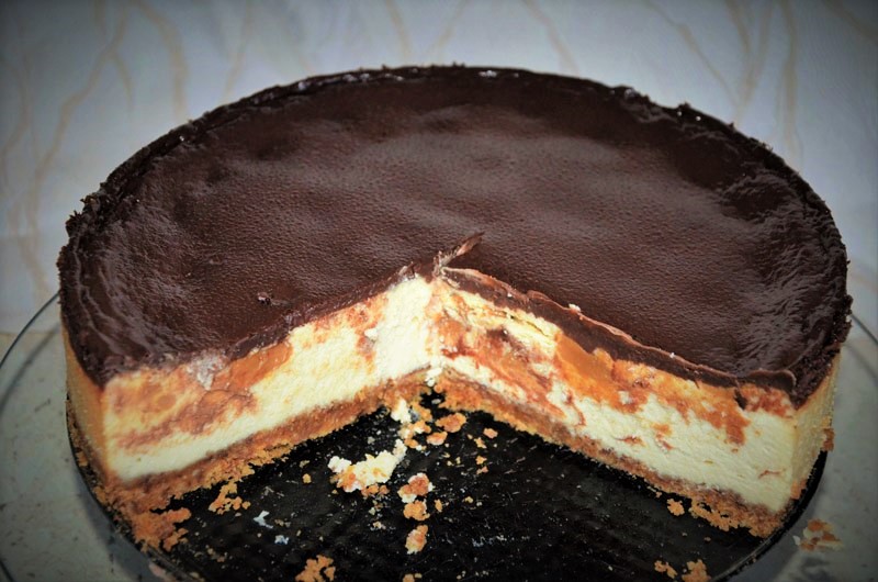 Pyszny, kremowy, rozpływający się w ustach sernik o delikatnym posmaku orzechów ziemnych. Smak serniczka dodatkowo podkreśla masa kajmakowa dodana do masy serowej w formie kleksów:)