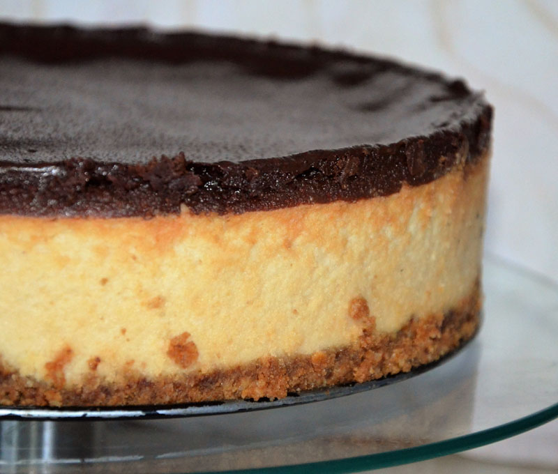 Po upływie 45 min. sernik wyjąć z piekarnika. Ustawić temp. 150 st. C, termoobieg. Na serniku równomiernie rozprowadzić przygotowaną polewę czekoladową. Włożyć do piekarnika i piec jeszcze przez 10 min. Po tym czasie wyłączyć piekarnik i studzić sernik przy uchylonych drzwiczkach piekarnika. Po całkowitym ostudzeniu zdjąć obręcz tortownicy i sernik włożyć do lodówki. Smacznego!