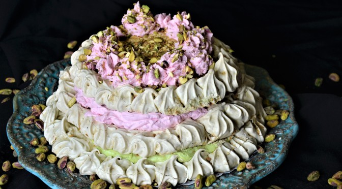 Tort bezowo pistacjowy z kremem różanym i pistacjowym